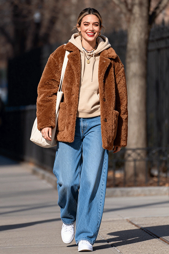 A plush brown teddy coat adds warmth and texture. Layer a beige or cream hoodie underneath for casual comfort. Pair with relaxed-fit blue jeans to balance oversized layers. Add white sneakers and a simple tote for practicality. This is a go-to outfit for weekend outings, travel days, or laid-back winter adventures.