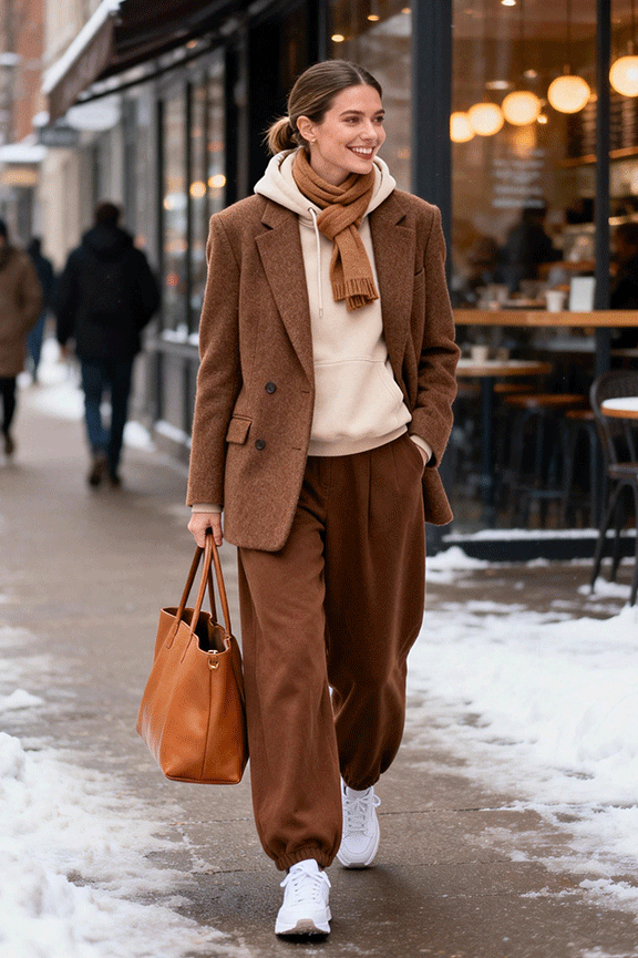 Layer a soft brown wool blazer over a cream or beige hoodie for casual sophistication. Pair with relaxed brown or tan trousers for comfort. Add white sneakers or loafers and a tote bag in cognac. This outfit blends cozy and structured elements for everyday winter style.