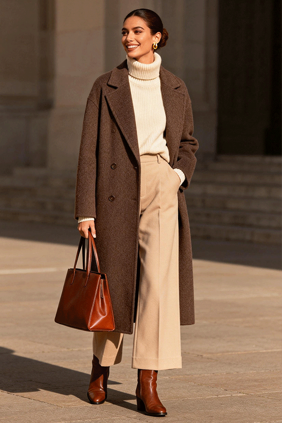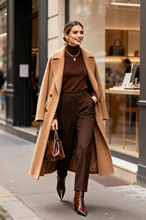 A camel long coat adds timeless sophistication to winter looks. Underneath, wear a fitted chocolate turtleneck for warmth and clean lines. Pair with dark brown tailored trousers to elevate the outfit without looking formal. Complete the look with pointed-toe boots in tan and a structured leather handbag. This combination is ideal for office days or refined winter dinners.