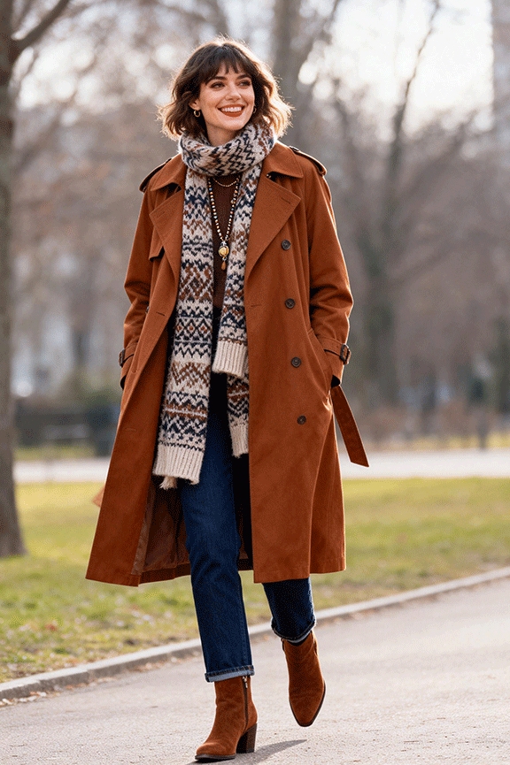 A caramel trench coat brings warmth to classic outerwear. Layer a neutral or patterned knit scarf for texture. Pair with dark blue or black jeans for balance. Finish with brown ankle boots and a medium leather bag. This look is timeless and versatile for everyday winter wear.