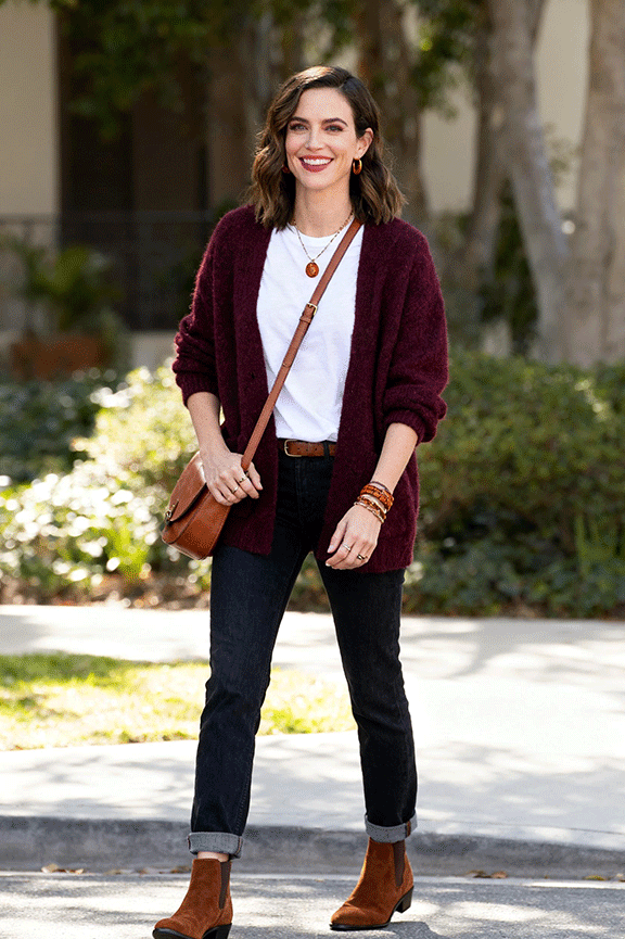 A chestnut cardigan keeps winter layers light yet cozy. Pair with a crisp white tee for freshness and contrast. Dark blue or black denim adds polish and balances the warm tones. Add brown ankle boots or loafers, and a tan shoulder bag for practicality. This outfit is relaxed but put-together, perfect for indoor gatherings or casual meetups.