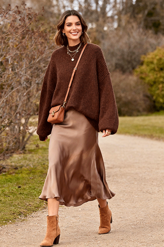 A chocolate oversized sweater brings relaxed warmth. Pair with a flowy midi skirt in taupe or caramel to add movement. Brown or tan ankle boots anchor the outfit. Accessorize with a small crossbody bag and delicate jewelry. Perfect for winter days when comfort and casual style are priorities.