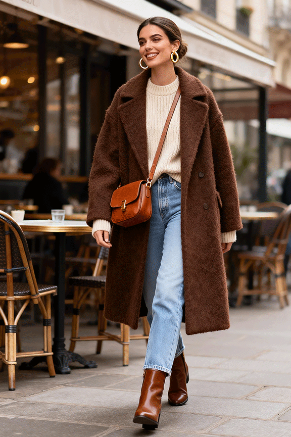 A deep chocolate wool coat brings instant warmth and polish. Layer a cream knit underneath for soft contrast, and pair with light-wash straight jeans to keep the look fresh. Add brown leather ankle boots to anchor the outfit and a crossbody bag in tan or caramel for casual practicality. Finish with gold hoop earrings for subtle shine. This ensemble works perfectly for weekend strolls or coffee dates in chilly weather.