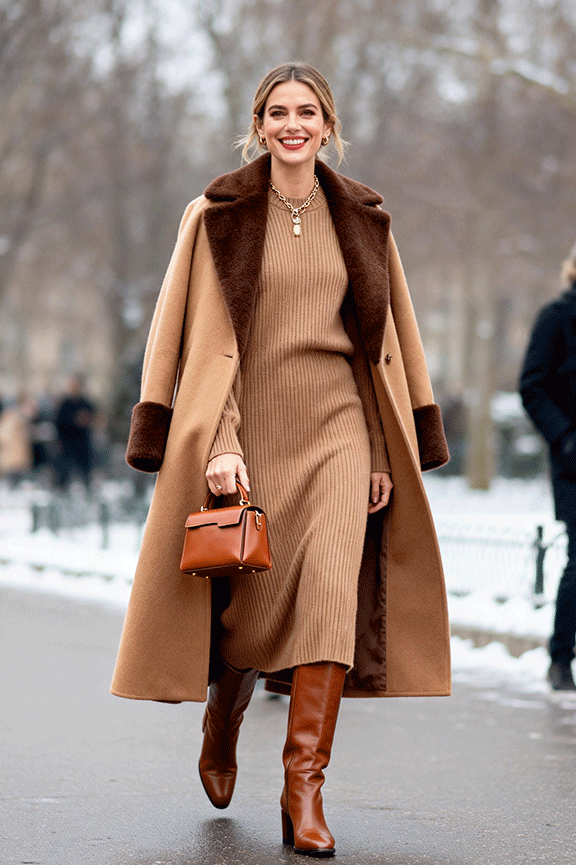 A cocoa-toned knit dress feels soft and flattering in cold weather. Pair with knee-high brown leather boots to elongate the legs. Layer a camel or chocolate wool coat on top for extra warmth. Carry a small structured handbag in tan or caramel. This outfit works well for dinner dates or casual evenings out in winter.
