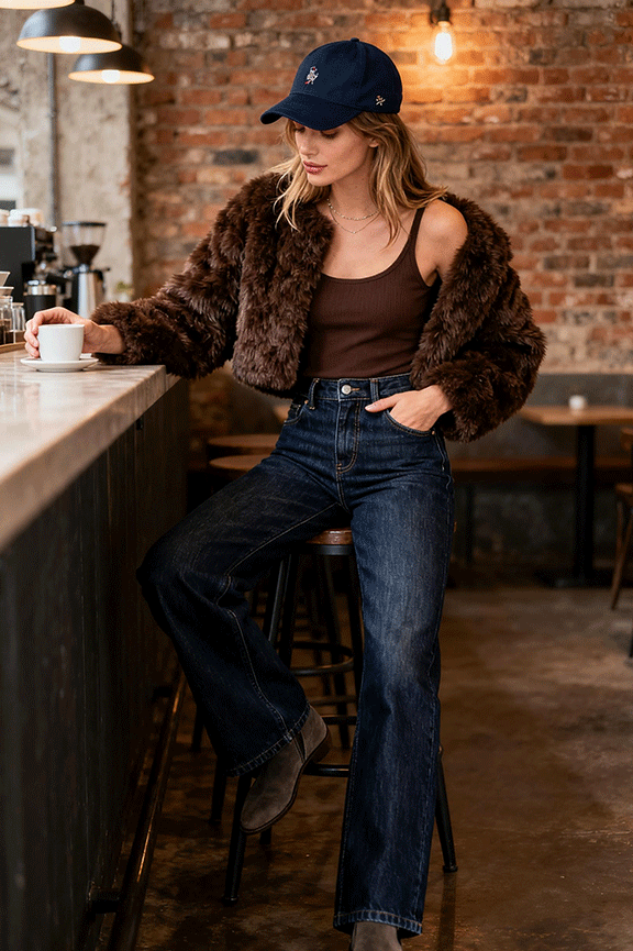 A dark brown plush cropped jacket anchors the outfit with warmth and texture, while the fitted camisole underneath keeps the silhouette sleek. Dark blue high-waist jeans add structure and elongate the legs, complementing the cropped jacket. A navy baseball cap introduces a casual, sporty touch and ties the look together. This ensemble feels cozy yet effortless, perfect for relaxed winter days.