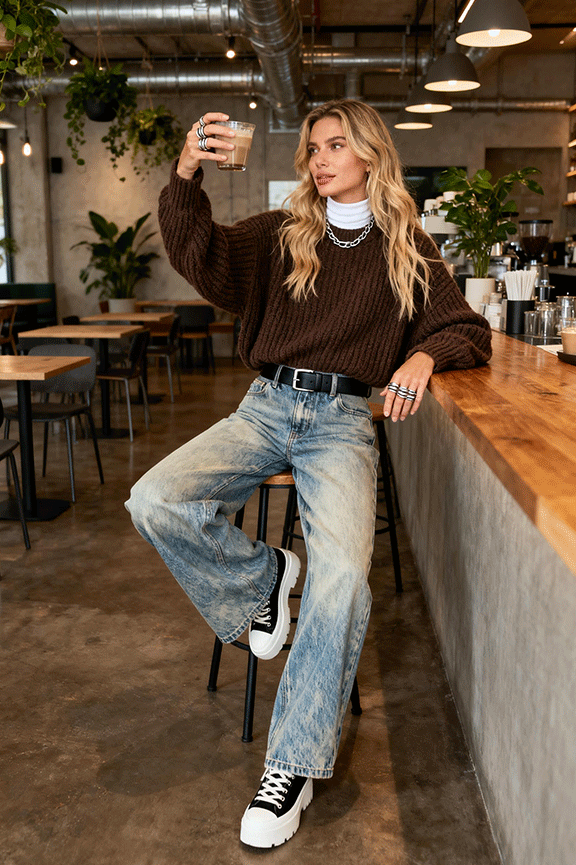 A dark brown oversized knit sweater anchors the outfit, layered over a crisp white turtleneck for contrast and warmth. Light blue wide-leg jeans create a relaxed silhouette, while black-and-white platform sneakers add a modern, sporty touch. A black wide belt cinches the waist, giving structure to the loose layers. This look feels effortlessly casual yet thoughtfully styled, making it a go-to for cozy winter days.