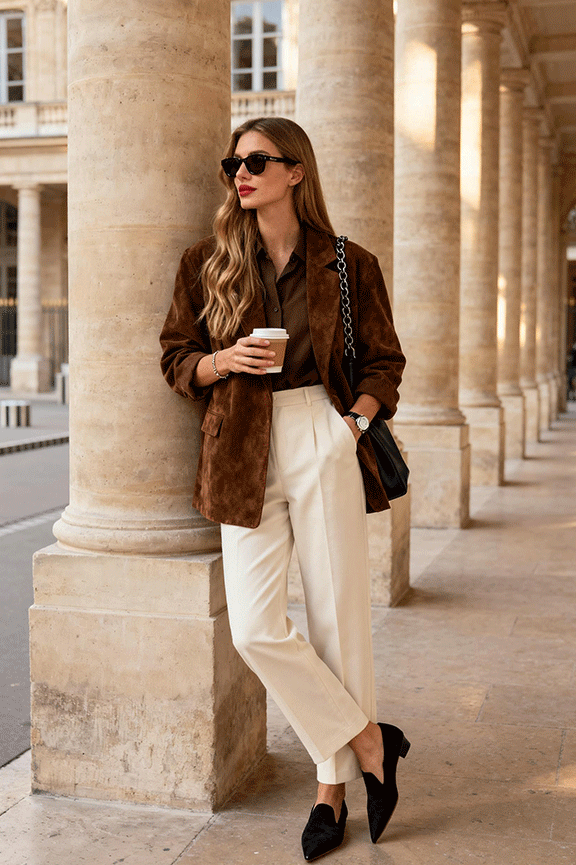 A dark brown suede blazer anchors the outfit, offering a soft yet structured look. Paired with a matching dark brown shirt, it creates a cohesive tonal base. Off-white straight-leg pants brighten the outfit and provide contrast against the deep brown layers. Black suede pointed-toe shoes and a black leather chain bag add sophistication and tie the look together with subtle elegance. This ensemble feels refined and polished, suitable for winter workdays or smart-casual occasions.