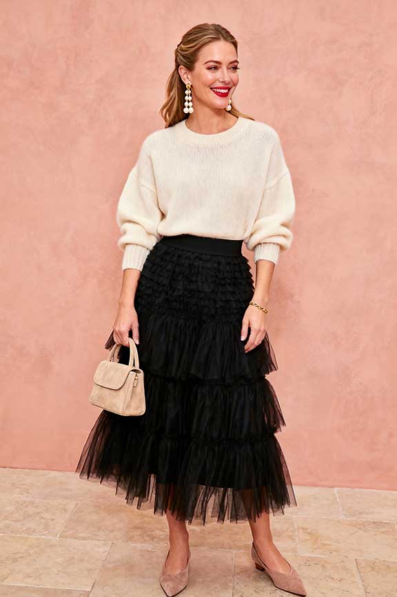 A black tulle skirt adds drama and festive flair. A cream sweater balances texture with comfort. Statement earrings bring sparkle and complete the ensemble. Perfect for holiday brunches, parties, or casual evenings.
