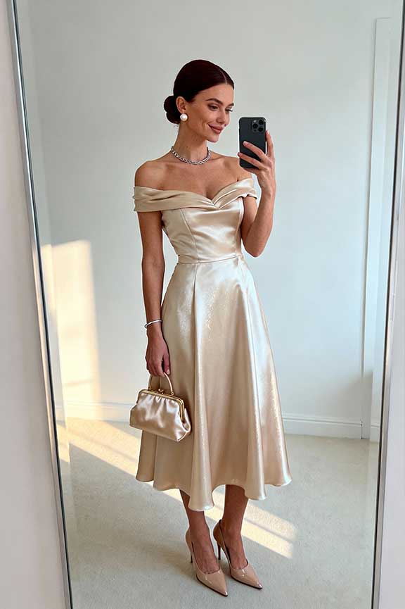 Champagne satin exudes elegance and soft shine. Nude heels elongate the legs and keep the focus on the dress. Minimal jewelry maintains sophistication. Ideal for cocktail parties or holiday evenings.