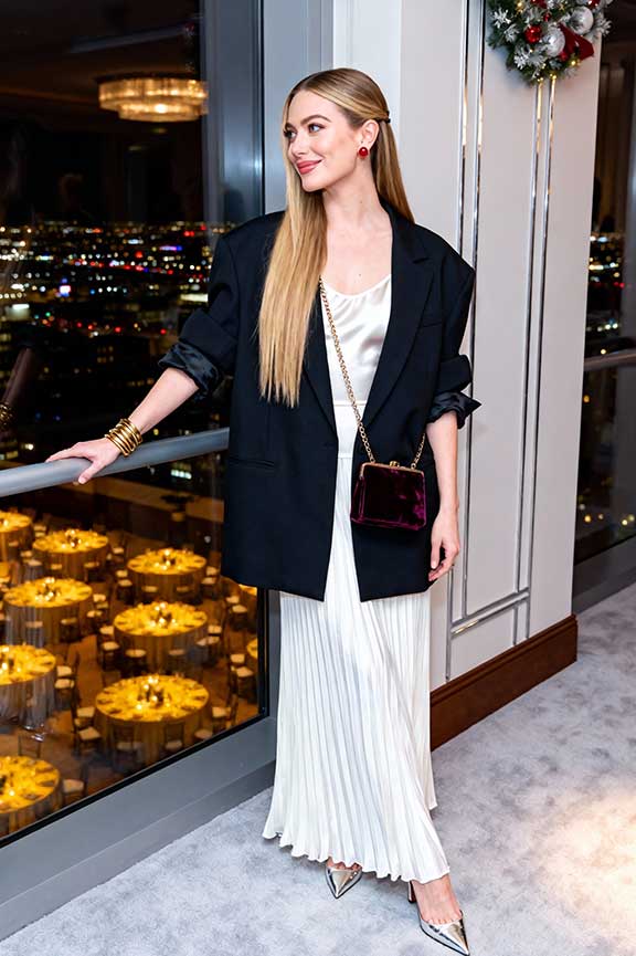 A black oversize blazer adds structure while keeping the look relaxed. Pairing it with a flowing white pleated maxi skirt brings movement and elegance. Bright accessories like a colorful bag or earrings inject festive energy. This combination is effortlessly chic for semi-formal parties.