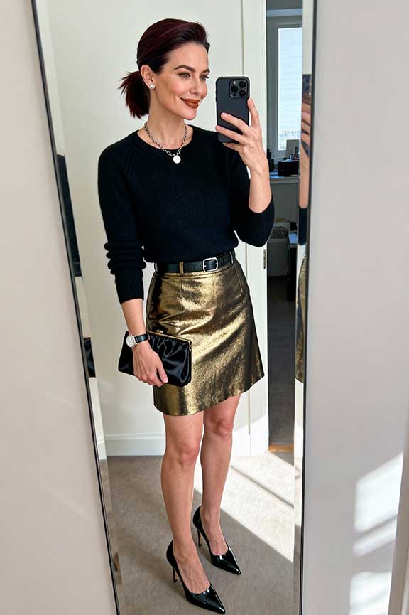A gold metallic skirt adds instant holiday sparkle. Pairing it with a fitted black sweater balances shine with warmth. Minimalist accessories keep the outfit chic and focused. This look is ideal for holiday office parties or festive evenings.