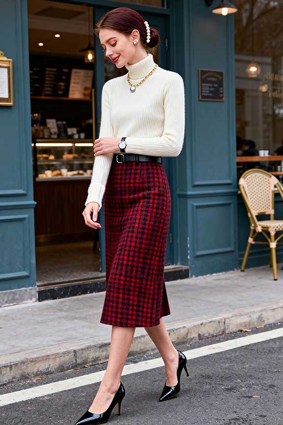 An ivory turtleneck keeps the look soft and cozy. Plaid wool midi skirts add seasonal texture and pattern. Black heels polish the outfit, creating a chic, office-to-party transition. Ideal for winter brunches or holiday events.