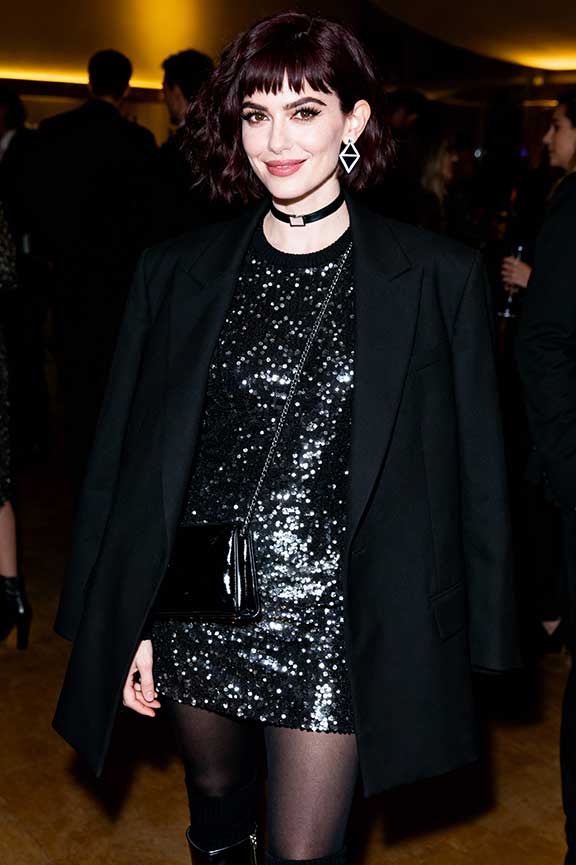 Layering a blazer over a sequined mini dress makes the look winter-appropriate while retaining party glamour. Ankle boots provide practicality and edge. Perfect for evenings out when you want sparkle without overdoing it.