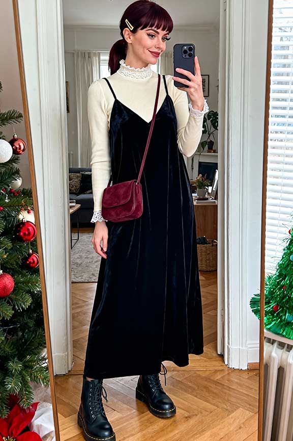 Black velvet instantly screams holiday-ready. Black heeled boots balance the vibrant color while keeping legs warm. If you’re worried about the cold, you can add a lace long sleeve tops for extra warmth. Gold jewelry adds elegance without overpowering the outfit. This look is ideal for festive dinners or cocktail parties.